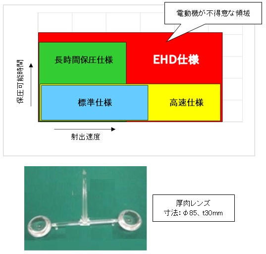 与传统的长时间保压规格机具有相同或更好的保压性能,并且可以充分支持厚透镜成型,这对于电机来说是不利的。